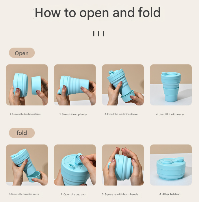 - To Expand: Remove the heat-insulating sleeve. Gently pull the cup body upwards from the base or top rim until fully extended. Slide the heat-insulating sleeve onto the middle of the cup. Fill with your beverage.