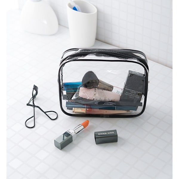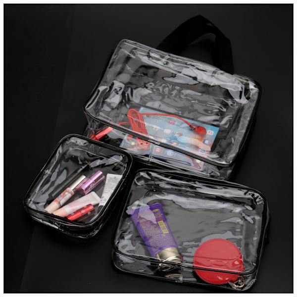 Set of 3 stylish and clean transparent toiletry bags with black edges. See exactly what you have with you and where it is! In these toiletry bags you can pack makeup, creams, hygiene items, skin care and anything else you want to take with you on your trip. The transparent design gives you an immediate overview of what you have in the toiletry bag and where it is. Perfect for finding what you want quickly and easily! The largest toiletry bag also has a handle so you can easily carry it with you!