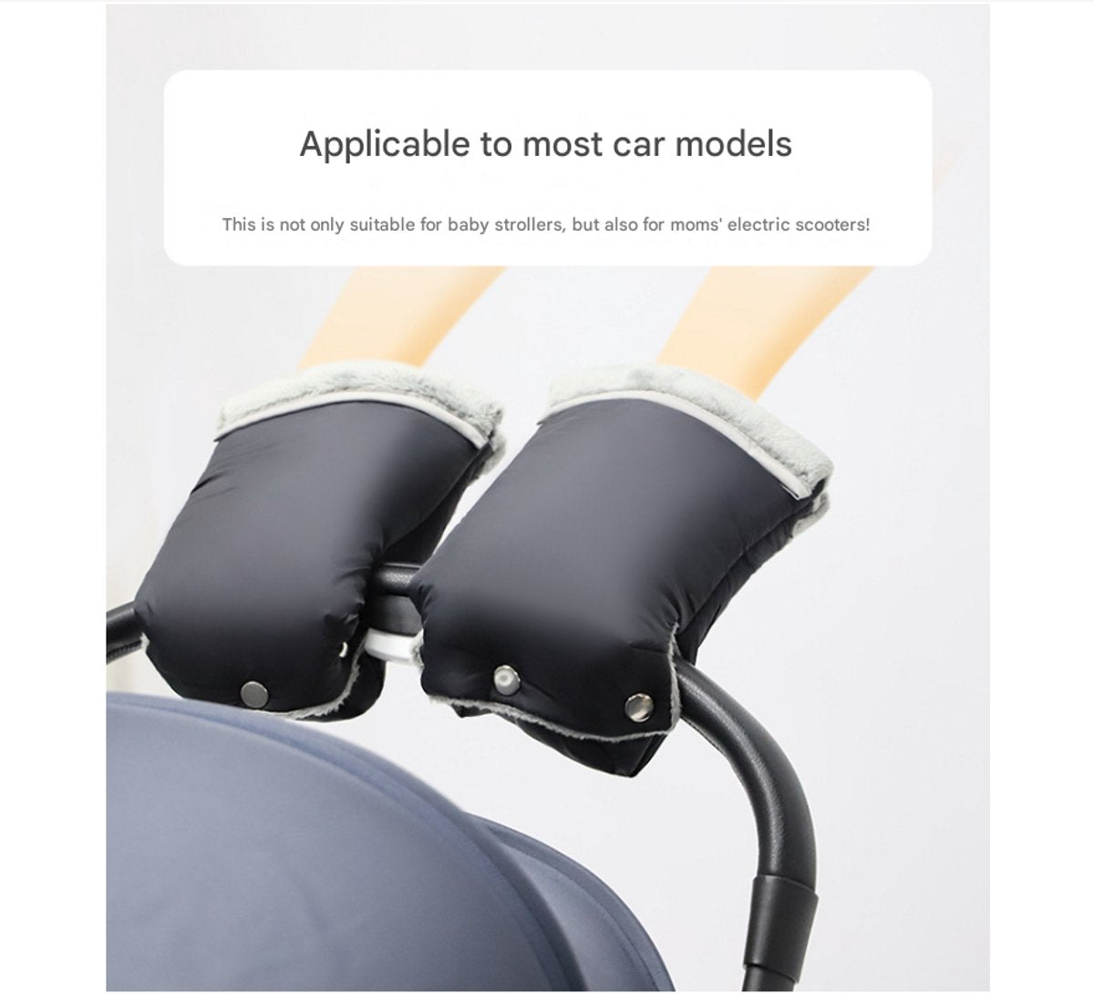 Winter Gloves with Warm Grips for Strollers These gloves with warm grips are specially designed for winter stroller outings. They are made of thick, windproof and waterproof material, and the inner layer is filled with soft, skin-friendly faux fleece. This creates a double thermal barrier that effectively protects against cold winds and keeps your hands warm while strolling. They are compatible with various stroller handle sizes and have a convenient click-and-go system for easy installation without hindering parental control. The overall construction is solid, with tight stitching, making them durable and long-lasting. They create a warm and cozy space for your baby's winter outings, making them a heartwarming choice for parents taking their little ones out in the winter. They also make a wonderful gift for new parents. Show more